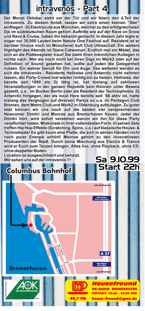 Der Monat Oktober steht vor der Tür und wir feiern den 4.Teil der intravenös. Zu diesem Anlaß, lassen wir extra einen kleinen Star einfliegen - Dj Electrocute aus München, welcher zu den erfolgreichsten Djs im süddeutschen Raum gehört. Auftritte wie auf der Rave on Snow und Rave & Cruise, haben ihn bekannt gemacht. In diesem Jahr legte er sogar vor 30.000 Leuten beim Nature One Festival auf. Resident ist er darüber hinaus noch im Münchener kult Club Ultraschall. Ein weiters Highlight des Abends ist Djane Catwoman. Endlich mal ein Mädel, das sich an die Plattenspieler traut! Sie steht ihren männlichen Kollegen in nichts nach. Wer sie noch nicht bei ihren Gigs im Werk2 oder auf der Definition of Sound gesehen hat, sollte auf jeden die Gelegenheit nutzen. Ein wahrer Genuß für Ohr und Auge. Des weiteren werden es sich die intravenös - Residents Hellraise und Antarctic nicht nehmen lassen, der Party-Crowd mal wieder richtig ein zu heizen. Hellraise, der bereits seit 1990 als Dj tätig ist, hat bislang auf zahllosen Veranstaltungen in der ganzen Republik sein Können unter Beweis gestellt, u.a. im Bunker Berlin oder als Resident der Technophobia. Dj Antarctic hingegen, der als local Hero bereits seit `88 aktiv ist, hatte bislang das Vergnügen auf diversen Partys so u.a. im Pentagon Club Bremen, dem Metro Club und Werk2 in Oldenburg aufzulegen. Zu guter letzt können wir uns noch auf die beiden viel versprechenden Newcomer Dimitri und Monroe aus Bremerhaven freuen. Jeder der Dimitri hört, wird sofort verstehen warum wir ihn für diese Party verpflichtet haben. Mixkünste in ihrer vollendesten Form. In seinen Sets treffen Hip Hop Effekte (Scratching, Spins, u.a.) auf klassische House- & Technobeats! Es gibt kaum eine Platte, die sich in seinen Händen nicht nach purer Energie anhört! Monroe gehört zu den innovativsten Produzenten der Stadt. Durch seine Mischung aus Electro & Trance wird er Euch zum Tanzen bringen. Alles live, ohne Playback, ohne CD, ohne doppelter Boden.