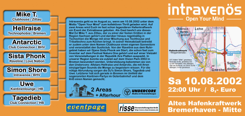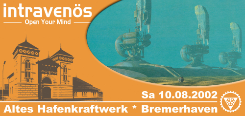 Intravenös geht es im August zu, wenn am 10.08.2002 unter dem Motto "Open Your Mind" zum kollektiven Thrill geladen wird. Auf zwei Areas wird Euch im fast schon legendären Hafenkraftwerk ein Event der Extraklasse geboten. Als Gast beehrt uns dieses Mal DJ Mike T. aus Zittau, der zu einer der festen Größen in der Region Sachsen gehört und darüber hinaus regelmäßig in Tschechien die Menge mit einer Mischung aus Techhouse und Tribaltechno zum Kochen bringt. In seiner Heimatstadt betreibt er zudem unter dem Namen Clubhouse einen eigenen Szenestore und veranstaltet den Sushiclub. Von der Raveline aus dem Ruhrgebiet haben wir Djane Sista Phonk am Start, die schon fast zum Inventar auf dem Festival Nature One gehört und auf einer Vielzahl von Veranstaltungen in der Republik ihre Platten auspackt. In unserer Region konnte sie zuletzt auf dem Vision Park 2002 in Bremen bewundert werden. Unterstützung bekommen sie von den Undercore- Allstars Hellraise und Antarctic, die mit ihren einzigartigen Sounds die Menge zu begeistern wissen. Für die nötige Abrundung sorgen die DJ's Simon Shore, Tagedieb und Uwe. Letzterer hat sich gerade in Bremen im Umfeld der sogenannten Kantinen-Partys im Güterbahnhof und dem K45 einen Namen gemacht.