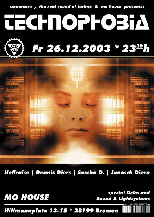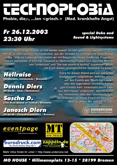 Am 26.12.2003 heißt es Technophobia; aus der Vorliebe für schräge und harte Klänge im Mai 1998 ins Leben gerufen bieten wir mit Beginn der neuen Staffel ein Programm das es mal wieder in sich hat. Passend zu Weihnachten haben sich dazu die Macher von "undercore" und "the real sound of techno" zusammen getan, um Euch dieses unvergleichliche Spektakel zu bieten.