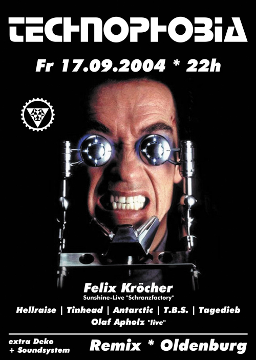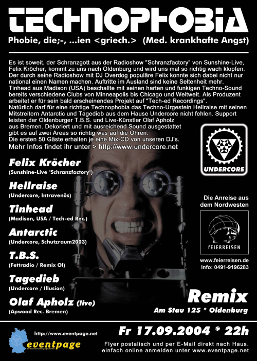 Natürlich darf für eine richtige Technophobia das Techno-Urgestein Hellraise mit seinen Mitstreitern Antarctic und Tagedieb aus dem Hause Undercore nicht fehlen. Support leisten der Oldenburger T.B.S. und Live-Künstler Olaf Apholz aus Bremen. Dekoriert und mit ausreichend Sound ausgestattet gibt es auf zwei Areas so richtig was auf die Ohren.