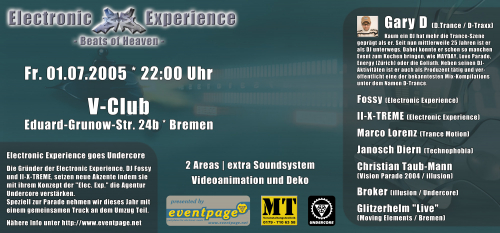 Die Gründer der Electronic Experience, DJ Fossy und II-X-TREME, setzen neue Akzente indem sie mit ihrem Konzept der "Elec. Exp." die Agentur Undercore verstärken. Speziell zur Parade nehmen wir dieses Jahr mit einem gemeinsamen Truck an dem Umzug Teil.