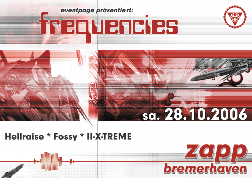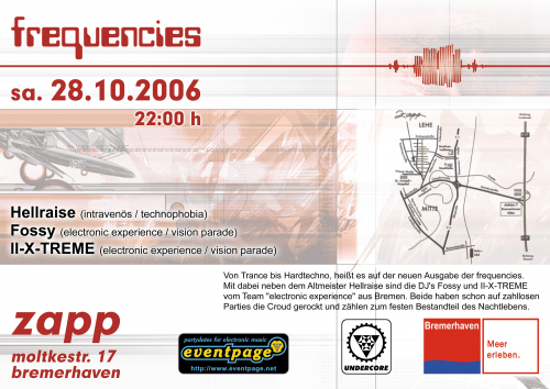 Von Trance bis Hardtechno, heißt es auf der neuen Ausgabe der frequencies. Mit dabei neben dem Altmeister Hellraise sind die DJ's Fossy und II-X-TREME vom Team "electronic experience" aus Bremen. Beide haben schon auf zahllosen Parties die Croud gerockt und zählen zum festen Bestandteil des Nachtlebens.